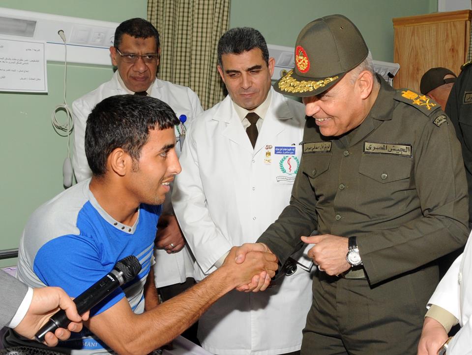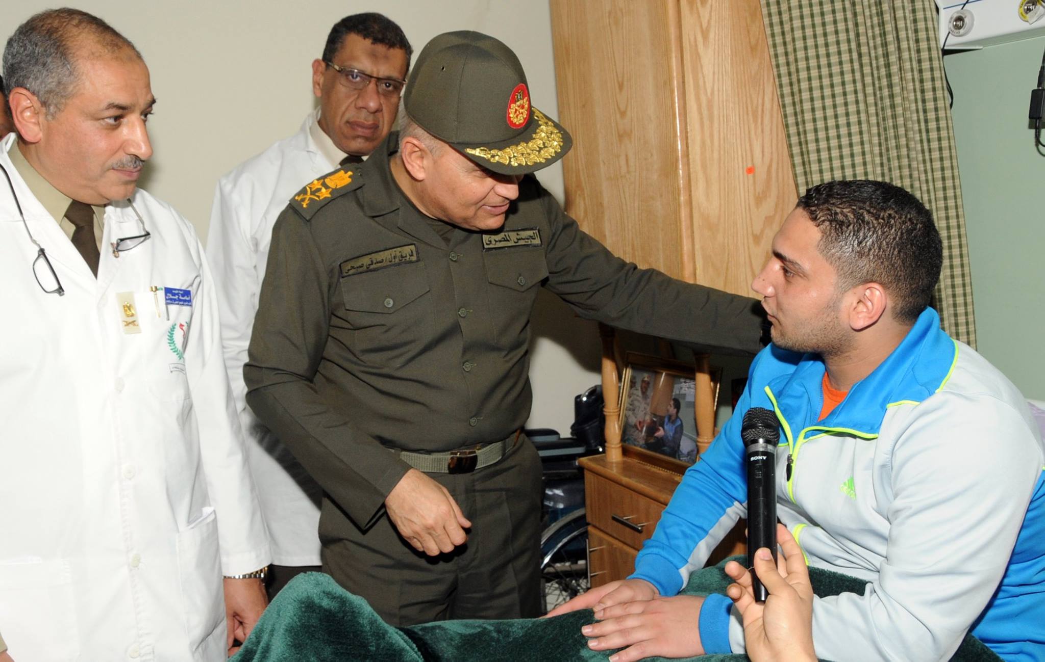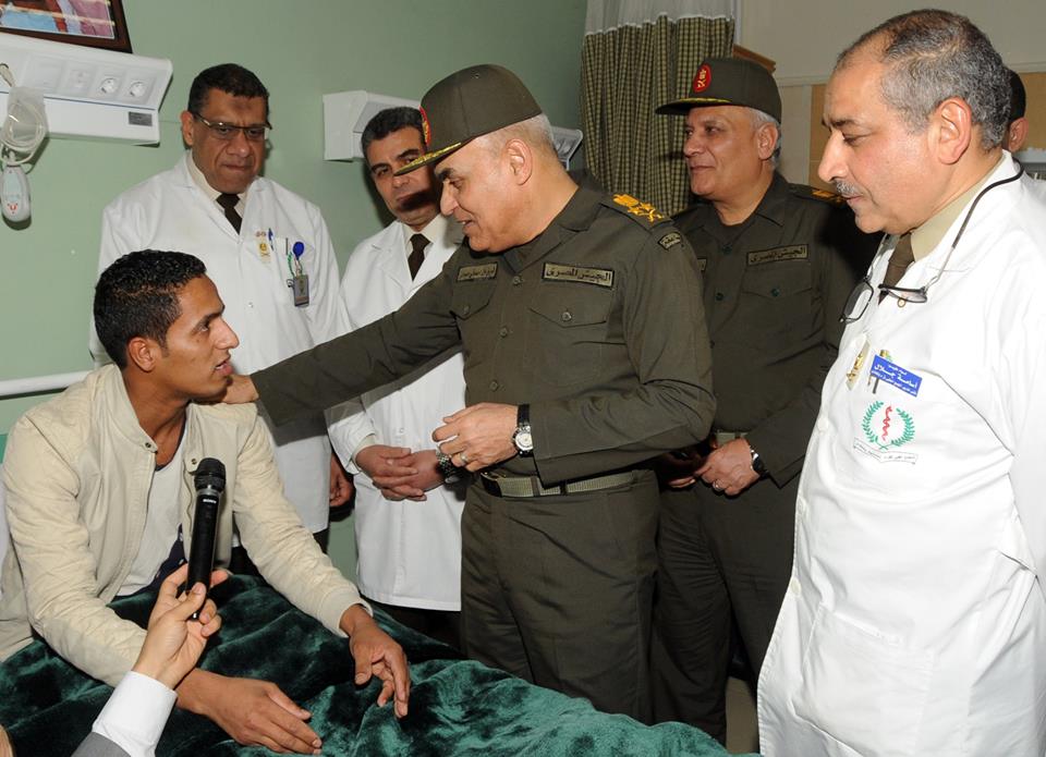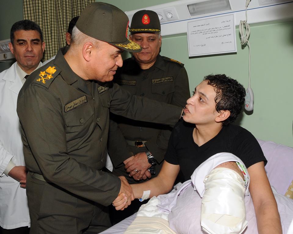 قام الفريق أول / صدقى صبحى القائد العام للقوات المسلحة وزير الدفاع والإنتاج الحربى بزيارة الضباط والصف والجنود من أبطال القوات المسلحة الذين أصيبوا أثناء أدائهم لمهامهم فى التصدى للإرهاب فى شمال سيناء للإطمئنان على حالتهم الصحية ، والذين يخضعون للعلاج حالياً بالمجمع الطبى للقوات المسلحة بالمعادى .