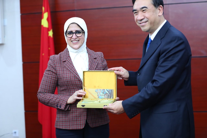 وأهدى”القائم بأعمال وزير الصحة الصيني” لوزيرة الصحة 1000 كاشف حديث لفيروس كورونا المستجد، كما قامت الوزيرة بإهدائه هدية الرئيس السيسي من المستلزمات الطبية والوقائية في إطار عمق العلاقات بين البلدين.
