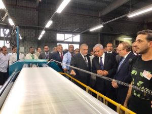 وزير التجارة والصناعة خلال زيارته للمنطقة الصناعية كوم أبو راضى بمحافظة بنى سويف مصنعين لتجهيز وتصنيع الأقمشة البوليستر