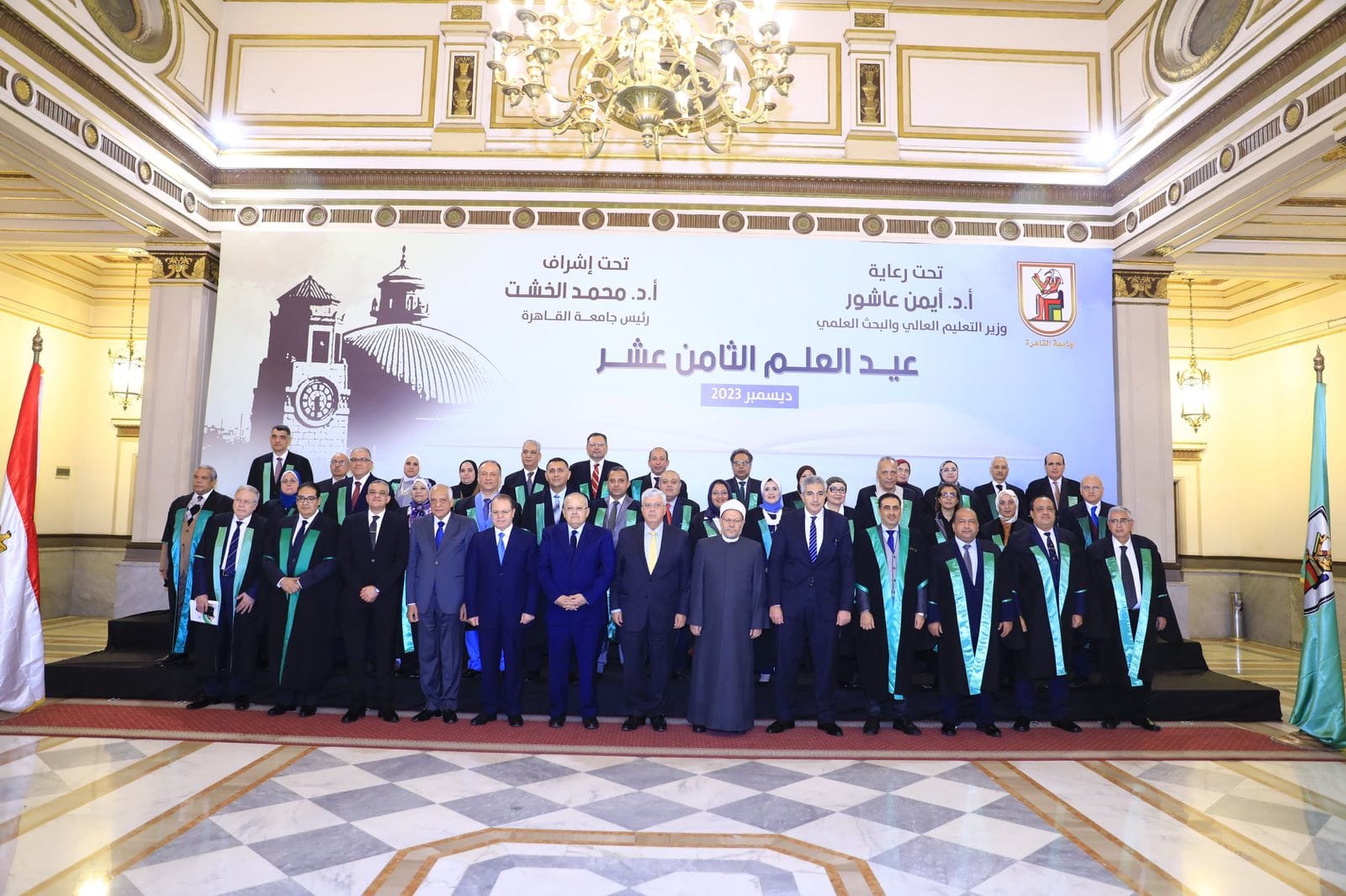 شهد د.أيمن عاشور وزير التعليم العالي والبحث العلمي احتفالية عيد العلم الثامن عشر بجامعة القاهرة، والتي تنظمها الجامعة؛ تكريمًا لعدد من السادة الوزراء و60 شخصية من علمائها ومفكريها وباحثيها الحاصلين على جوائز الدولة والجامعة في مختلف المجالات العلمية عن عامي 2022 و2023، بحضور السيد اللواء/ أحمد راشد محافظ الجيزة، ود.محمد الخشت رئيس الجامعة، والسادة نواب رئيس الجامعة، وعمداء الكليات، ولفيف من أعضاء هيئة التدريس، والشخصيات العامة، بقاعة الاحتفالات الكبرى بالجامعة.