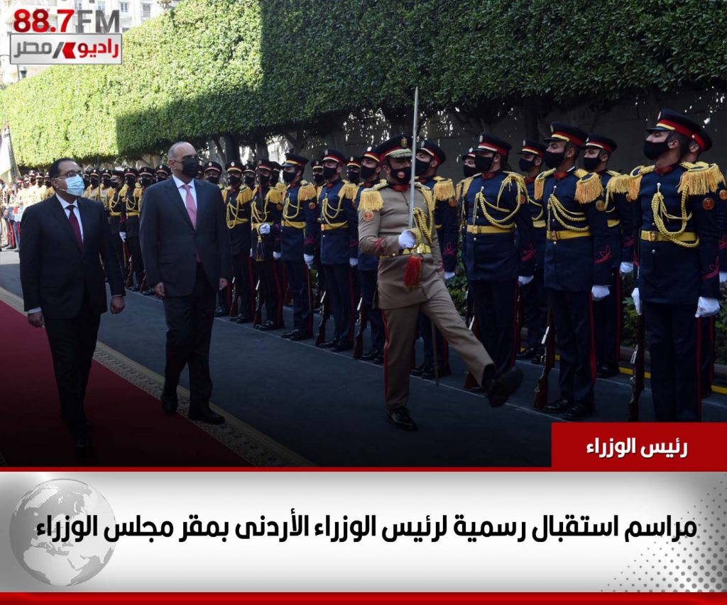 استقبل الدكتور مصطفي مدبولي، رئيس مجلس الوزراء، اليوم، الدكتور بشر الخصاونة، رئيس وزراء المملكة الأردنية الهاشمية، وذلك بمقر رئاسة مجلس الوزراء، حيث أُجريت مراسم استقبال رسمية للضيف الأردني والوفد المرافق له، وتم عزف السلام الوطني لكلا البلدين، واستعراض حرس الشرف.