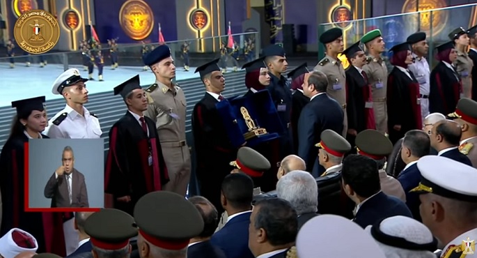 كما قدم أوائل خريجى الجامعات المصرية التهنئة لمصر بتخريج دفعة جديدة من خريجى الكليات العسكرية وقدموا للرئيس درع الجامعات المصرية.