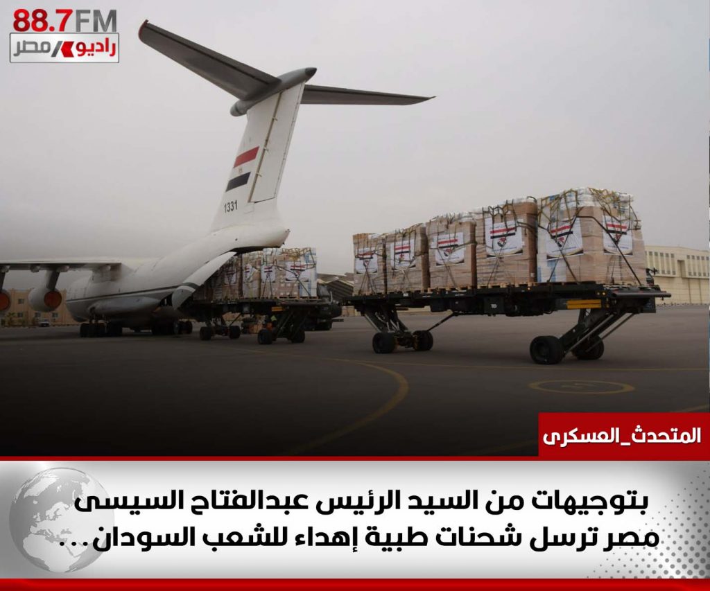تنفيذاً لتوجيهات الرئيس عبد الفتاح السيسي القائد الأعلى للقوات المسلحة ، وفى إطار دعم وتضامن مصر مع الشعب السودانى الشقيق فى مختلف الأزمات، أقلعت أربع طائرات نقل عسكرية من قاعدة شرق القاهرة الجوية متجهة إلى مطار الخرطوم السوداني محملة بأطنان من الشحنات الطبية المقدمة كهدية من وزارة الصحة والسكان المصرية.