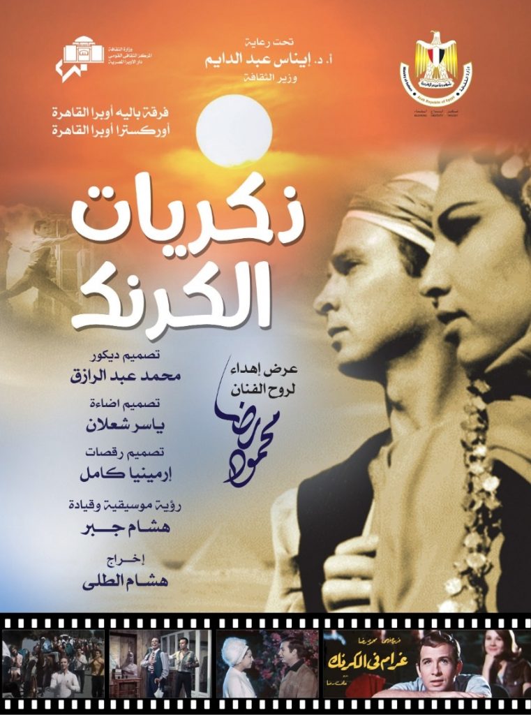 تشهد الدكتورة ايناس عبد الدايم وزيرة الثقافة الاحتفالية الفنية المبتكرة بعنوان ذكريات الكرنك التى تنظمها دار الاوبرا برئاسة الدكتور مجدى صابر وتاتى استمرارا لاحتفاء الثقافة المصرية باسطورة الفن الشعبى محمود رضا وتقدمها فرقة باليه اوبرا القاهرة تحت اشراف مديرها الفنى ارمينيا كامل بمصاحبة اوركسترا اوبرا القاهرة قيادة ورؤية موسيقية المايسترو هشام جبر ومن اخراج هشام الطلى وذلك فى الثامنة مساء الاربعاء 30 سبتمبر على المسرح الكبير .