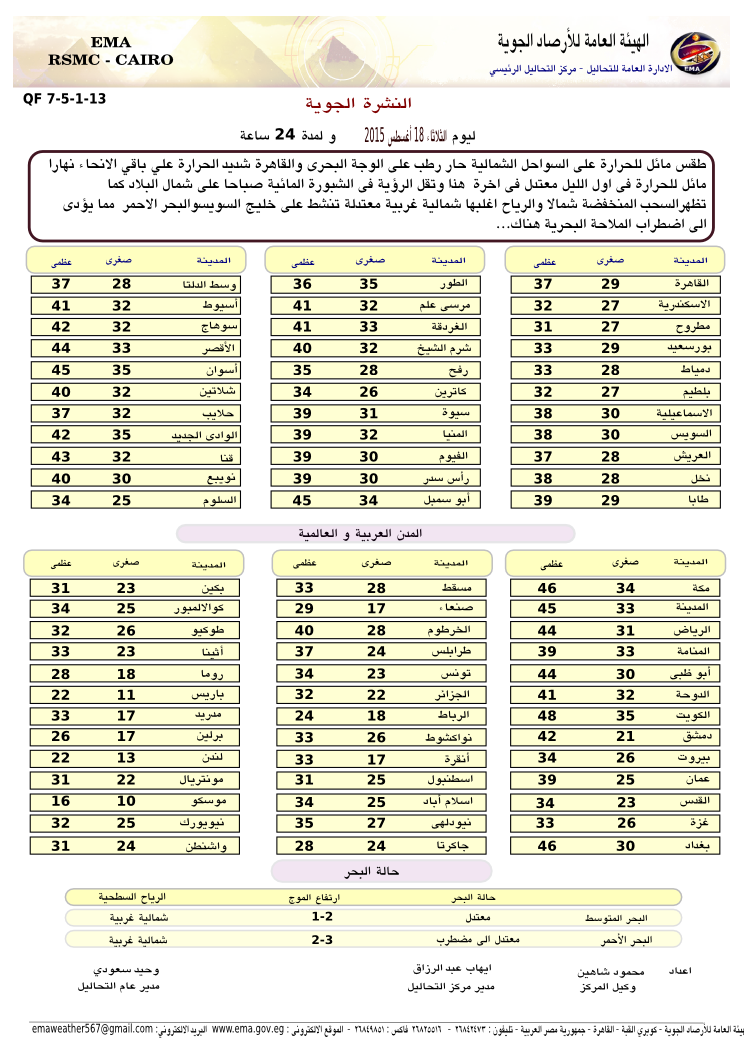 أن الارتفاع فى درجات الحرارة يعتبر أعلى من معدلاته الطبيعية خلال هذا الوقت من العام بحوالى 7 درجات. ويتوقع خبراء الأرصاد الجوية أن يسود اليوم الاثنين طقس شديد الحرارة على كل الأنحاء نهاراً مائل للحرارة فى أول الليل، معتدل فى آخره. وتقل الرؤية فى الشبورة المائية صباحاً على شمال البلاد، كما تظهر السحب المنخفضة شمالا والرياح أغلبها شمالية شرقية معتدلة تنشط على شمال الصعيد وعلى خليج السويس والبحر الأحمر مما يؤدى إلى اضطراب الملاحة البحرية هناك.