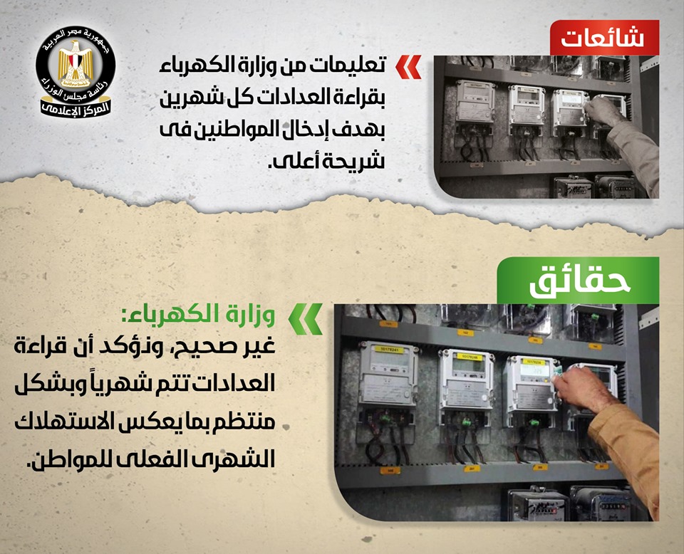 تداولت بعض وسائل الإعلام وصفحات التواصل الاجتماعي أنباء حول إصدار تعليمات من وزارة الكهرباء للمحصلين بقراءة العدادات كل شهرين بهدف إدخال المواطنين في شريحة أعلى للكهرباء، وقد قام المركز الإعلامي لمجلس الوزراء بالتواصل مع وزارة الكهرباء والطاقة المتجددة, والتي نفت تلك الأنباء بشكل قاطع، مُؤكدةً أنه لا صحة لما تردد حول إصدار تعليمات من وزارة الكهرباء للمحصلين بقراءة العدادات كل شهرين، مُوضحةً أن قراءة العدادات تتم شهرياً وبشكل منتظم بما يعكس الاستهلاك الشهري الفعلي للمواطن، وأن كل ما يُثار في هذا الشأن مجرد شائعات تستهدف إثارة غضب المواطنين.