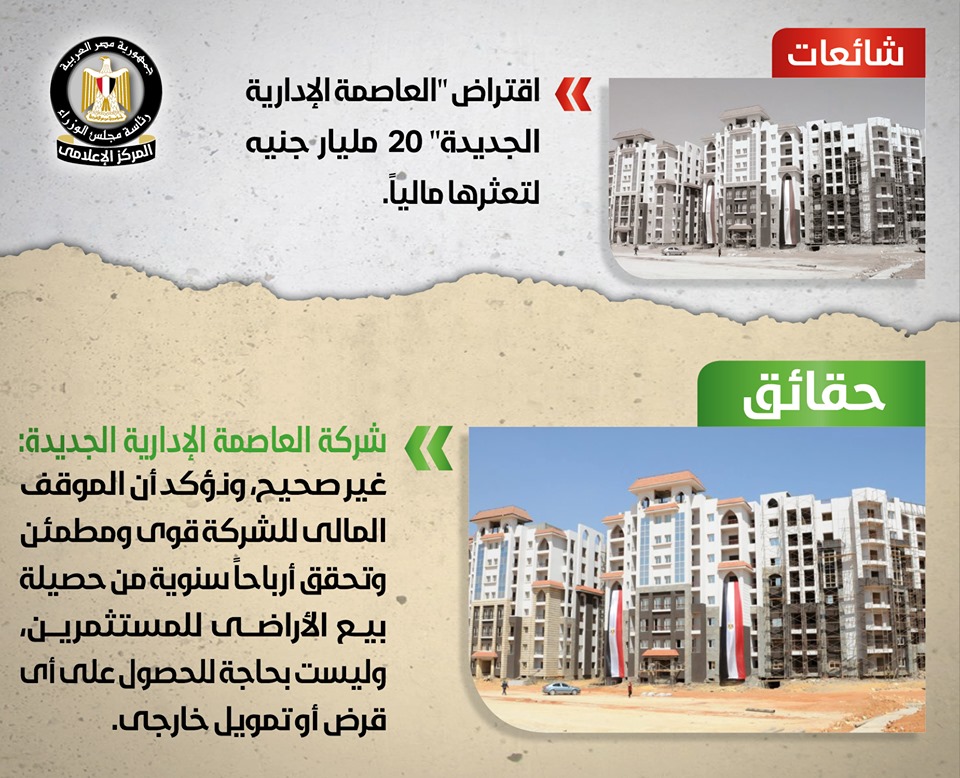 تداولت بعض وسائل الإعلام وصفحات التواصل الاجتماعي أنباء حول اعتزام شركة العاصمة الإدارية الجديدة الحصول على قروض من البنوك المصرية بقيمة 20 مليار جنيه نتيجة تعثرها المالي، وقد قام المركز الإعلامي لمجلس الوزراء بالتواصل مع شركة العاصمة الإدارية الجديدة, والتي نفت تلك الأنباء بشكل قاطع، مُؤكدةً أنه لا صحة لما تردد حول اعتزام شركة العاصمة الإدارية الجديدة الحصول على قروض من البنوك المصرية بقيمة 20 مليار جنيه لتعثرها مالياً، وأن الموقف المالي للشركة قوي ومُطمئِن وتحقق أرباحاً سنوية من حصيلة بيع الأراضي للمستثمرين، وليست بحاجة للحصول على أي قرض أو تمويل خارجي، وأن كل ما يُثار في هذا الشأن مجرد شائعات لا أساس لها من الصحة تستهدف النيل من ثقة المواطنين والمستثمرين في جدوى هذا المشروع العملاق.