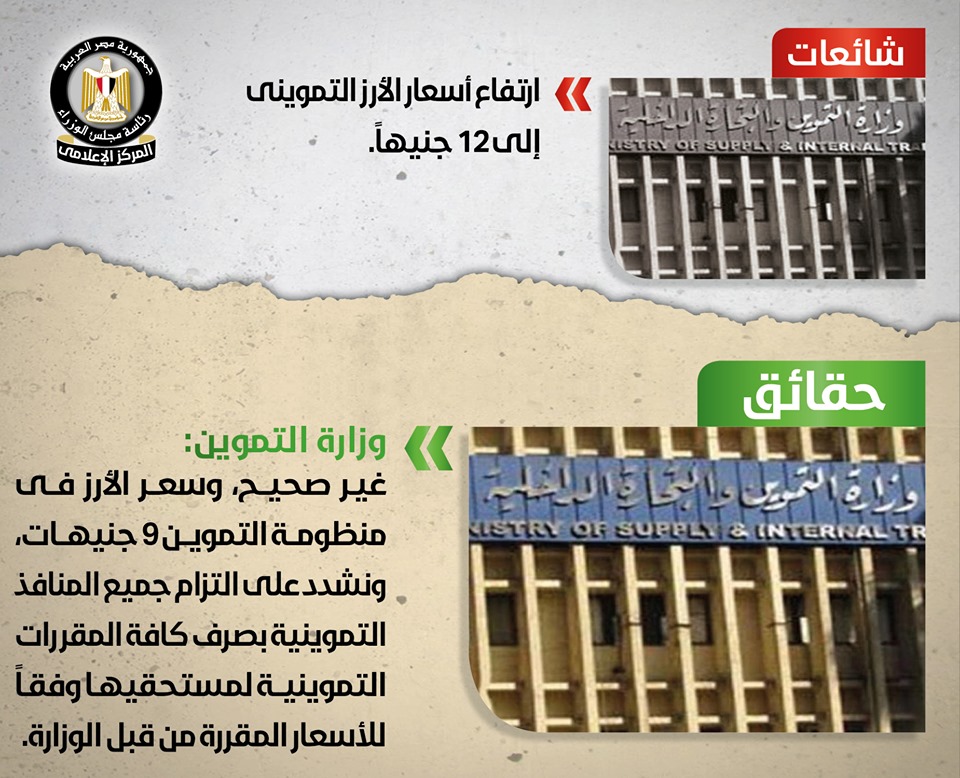 تداولت بعض المواقع الإلكترونية وصفحات التواصل الاجتماعي أنباء تُفيد بارتفاع أسعار الأرز في جميع المنافذ التموينية إلـى 12 جنيهًا، وقد قام المركز الإعلامي لمجلس الوزراء بالتواصل مع وزارة التموين والتجارة الداخلية، والتي نفت تلك الأنباء تماماً, مُؤكدةً أنه لا صحة على الإطلاق لارتفاع أسعار الأرز التمويني إلـى 12 جنيهًا، بل على العكس فإن سعره في منظومة التموين 9 جنيهات، مُشددةً على التزام جميع المنافذ التموينية بصرف كافة المقررات التموينية لمستحقيها وفقاً للأسعار المقررة من قبل الوزارة، وأن كل ما يُثار في هذا الشأن شائعات تستهدف إثارة غضب حاملي البطاقات التموينية.