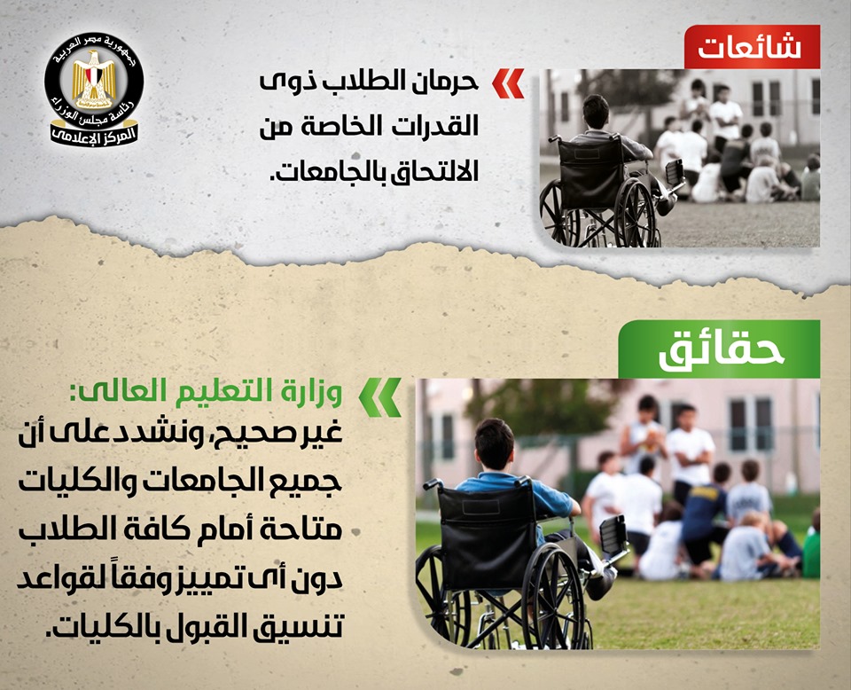 تداولت صفحات التواصل الاجتماعي أنباء بشأن قيام وزارة التعليم العالي بحرمان الطلاب ذوي القدرات الخاصة من الالتحاق بالجامعات وإجبارهم على كليات محددة, وقد قام المركز الإعلامي لمجلس الوزراء بالتواصل مع وزارة التعليم العالي والبحث العلمي, والتي نفت تلك الأنباء بشكل قاطع، مُؤكدةً أنه لا صحة على الإطلاق لمنع الطلاب ذوي القدرات الخاصة أو حرمانهم من دخول أي كلية من الكليات، وأن جميع الجامعات والكليات متاحة أمام كافة الطلاب دون أي تمييز وفقاً لتنسيق القبول بالكليات، مُشددةً على أن كل ما يثار في هذا الشأن مجرد شائعات تستهدف إثارة غضب الرأي العام.