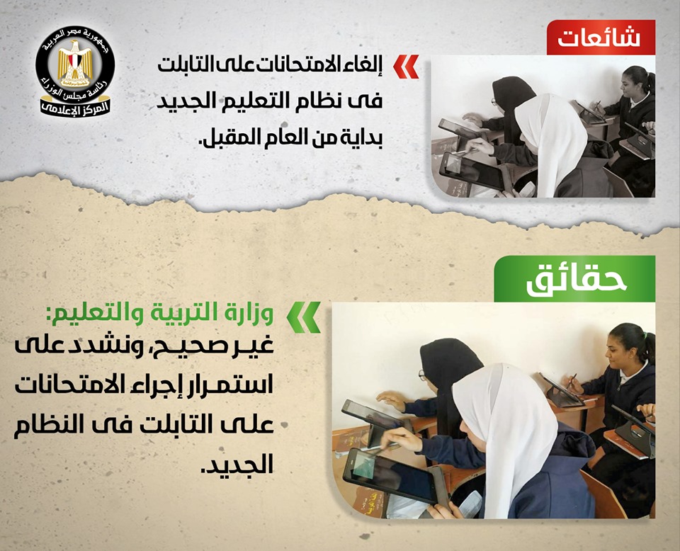 تداولت صفحات التواصل الاجتماعي أنباء بشأن قيام وزارة التربية والتعليم والتعليم الفني بإلغاء نظام الامتحانات على التابلت بداية من العام الدراسي المقبل 2019/ 2020, وقد قام المركز الإعلامي لمجلس الوزراء بالتواصل مع وزارة التربية والتعليم والتعليم الفني, والتي نفت تلك الأنباء بشكل قاطع، مُؤكدةً أنه لا صحة على الإطلاق لإلغاء الامتحانات على التابلت في نظام التعليم الجديد، مُشددةً على استمرار إجراء الامتحانات على التابلت في النظام الجديد، وأن كل ما يتردد من أنباء حول هذا الشأن شائعات تستهدف تشويه نظام التعليم الجديد.