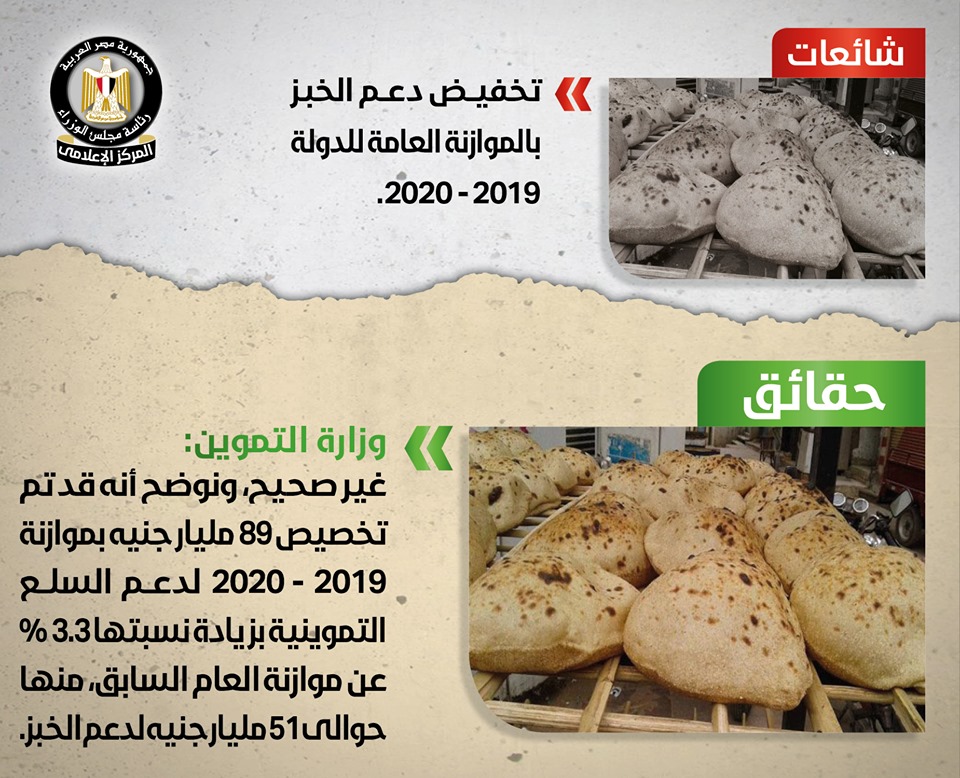 تردد في بعض المواقع الإلكترونية وصفحات التواصل الاجتماعي أنباء عن تخفيض الحكومة دعم رغيف الخبز بالموازنة العامة للدولة للعام المالي الحالي 2019/ 2020، وقد قام المركز الإعلامي لمجلس الوزراء بالتواصل مع وزارة التموين، والتي نفت تلك الأنباء تماماً، مُؤكدةً أنه لا صحة على الإطلاق لما تم تداوله حول تخفيض الحكومة لدعم الخبز بالموازنة العامة للدولة 2019/ 2020، بل على العكس فإنه قد تم تخصيص89 مليار جنيه بموازنة 2019/2020 لدعم السلع التموينية بزيادة نسبتها 3.3% عن موازنة العام السابق منها حوالي 51 مليار جنيه لدعم الخبز، وأن كل ما يتردد في هذا الشأن مجرد شائعات تستهدف إثارة بلبلة الرأي العام.