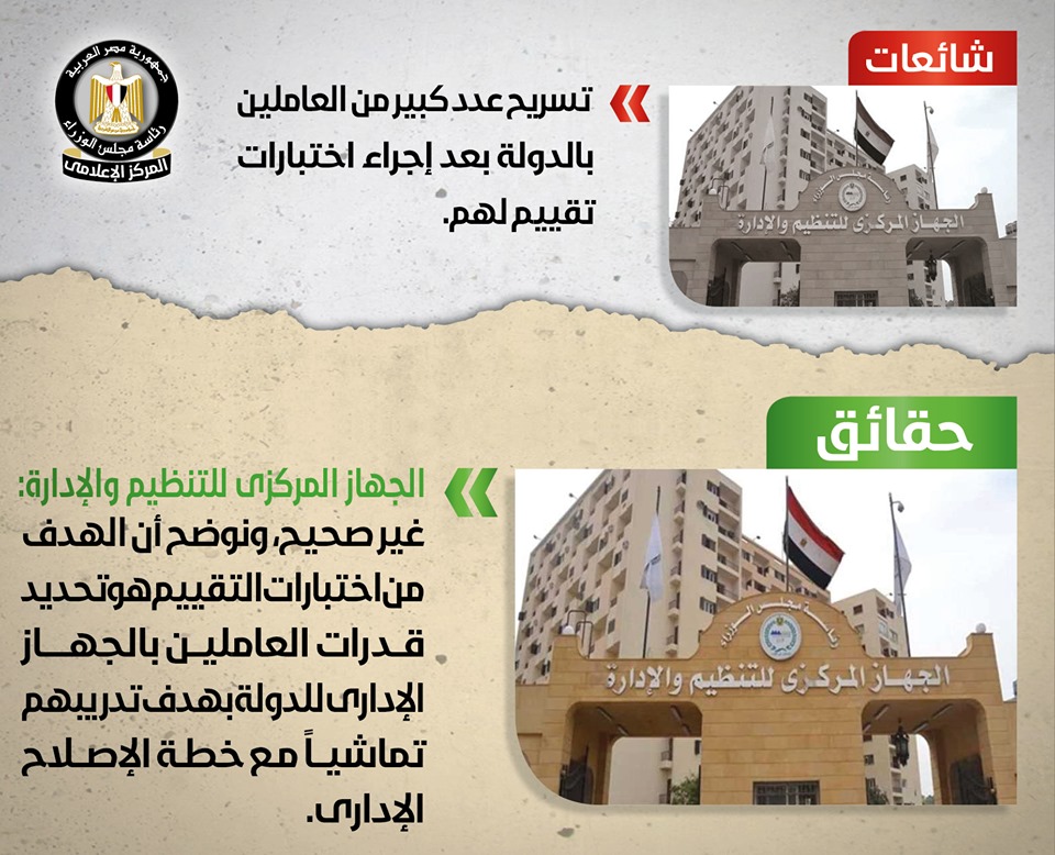 تردد في بعض المواقع الإلكترونية وصفحات التواصل الاجتماعي أنباء حول نية الحكومة لتسريح عدد كبير من موظفي الجهاز الإداري للدولة بناءً على نتائج اختبارات التقييم، وذلك في إطار خطة الإصلاح الإداري، وقد قام المركز الإعلامي لمجلس الوزراء بالتواصل مع الجهاز المركزي للتنظيم والإدارة, والذي نفى تلك الأنباء بشكل قاطع، مُؤكداً أنه لا صحة لتسريح أي من الموظفين بناءً على نتائج اختبارات تقييم العاملين بالدولة، مُوضحاً أن الهدف من اختبارات التقييم هو تحديد قدرات العاملين بالجهاز الإداري للدولة بهدف تدريبهم تماشياً مع خطة الإصلاح الإداري، مُشدداً على أن الحكومة حريصة كل الحرص على حقوق كافة الموظفين وعدم المساس بها مُطلقاً، وأن كل ما يُثار حول هذا الشأن مجرد شائعات لا أساس لها من الصحة تستهدف إثارة غضب مُوظفي الدولة.