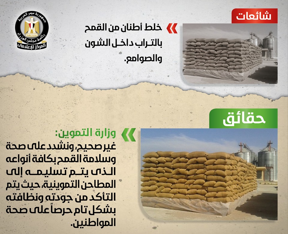 أُثير في بعض المواقع الإلكترونية وصفحات التواصل الاجتماعي أخبار بشأن خلط وزارة التموين أطنان كبيرة من القمح بالتراب داخل الشون والصوامع بمختلف المحافظات, وقد قام المركز الإعلامي لمجلس الوزراء بالتواصل مع وزارة التموين والتجارة الداخلية, والتي نفت تلك الأنباء تماماً، مُؤكدةً أنه لا صحة على الإطلاق لما تردد حول خلط أطنان من القمح بالتراب داخل الشون والصوامع بمختلف المحافظات، مُشددةً على صحة وسلامة القمح بكافة أنواعه الذي يتم تسليمه إلى المطاحن التموينية، حيث يتم التأكد من جودته ونظافته بشكل تام حرصاً على صحة المواطنين، وأن كل ما يُثار حول هذا الموضوع مجرد شائعات تستهدف إثارة البلبلة وقلق المواطنين.