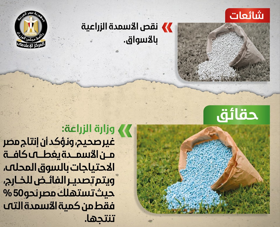 Bottom of Form تداولت بعض المواقع الإلكترونية وصفحات التواصل الاجتماعي أنباء حول وجود نقص في الأسمدة الزراعية بالأسواق، وقد قام المركز الإعلامي لمجلس الوزراء بالتواصل مع وزارة الزراعة واستصلاح الأراضي, والتي نفت صحة تلك الأنباء تماماً، مُؤكدةً على عدم وجود أي نقص في الأسمدة الزراعية بالأسواق، حيث أن إنتاج مصر من الأسمدة يغطي كافة الاحتياجات بالسوق المحلي، ويتم تصدير الفائض للخارج، مُشيرةً إلى أن مصر تستهلك