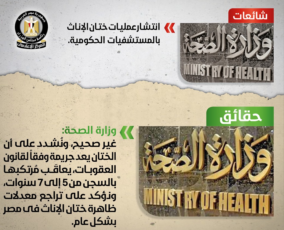وجود أي استفسارات أو شكاوى فنية أو تجارية متعلقة بخدمات الكهرباء يرجى الاتصال على الخط الساخن (121). تردد في بعض وسائل الإعلام والمواقع الإلكترونية وصفحات التواصل الاجتماعي أنباء حول انتشار عمليات ختان الإناث بالمستشفيات الحكومية، وقد قام المركز الإعلامي لمجلس الوزراء بالتواصل مع وزارة الصحة والسكان، والتي نفت صحة تلك الأنباء تمامًا, مُؤكدةً أنه لا صحة لما تردد حول انتشار عمليات ختان الإناث بالمستشفيات الحكومية، مُشددةً على أن الختان يعد جريمة وفقاً لقانون العقوبات، يعاقَب مُرتكبها بالسجن من 5 إلى 7 سنوات، مُوضحةً تراجع معدلات ظاهرة ختان الإناث في مصر بشكل