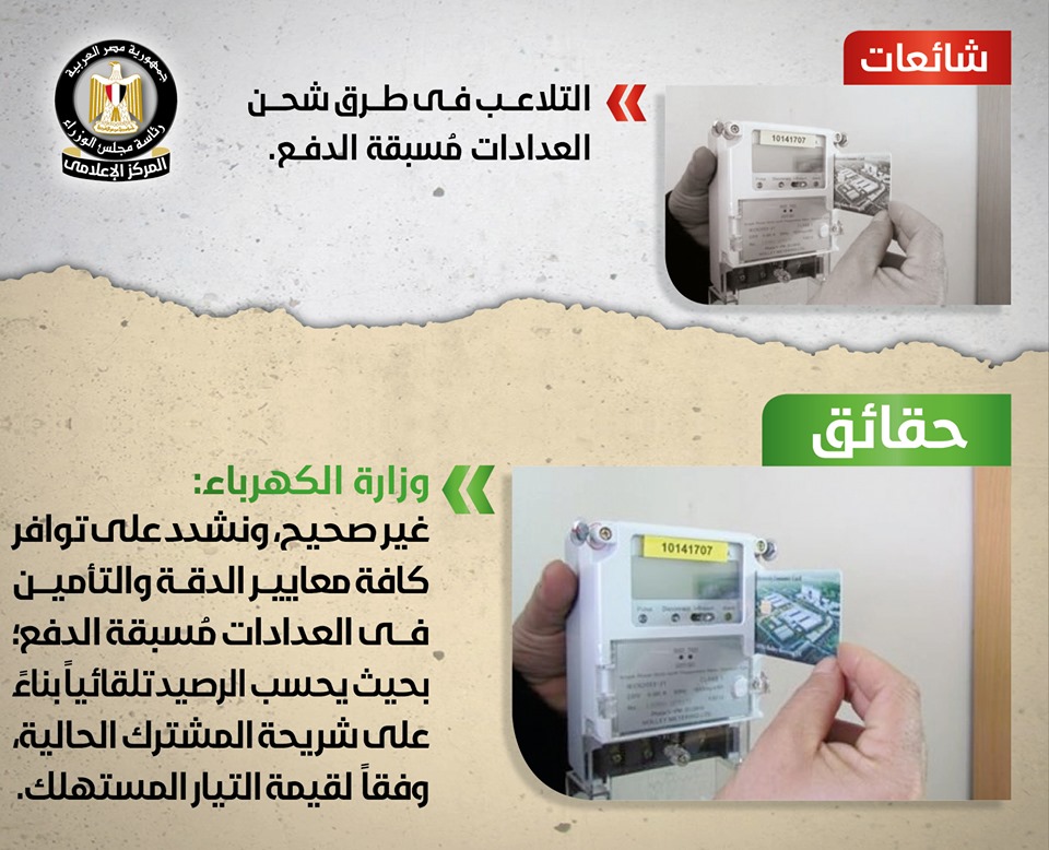 - انتشر في بعض المواقع الإلكترونية وصفحات التواصل الاجتماعي أنباء حولالتلاعب في طرق شحن العدادات مُسبقة الدفع مما تتسب في إدخال المواطن في شريحة أعلى،وقد قام المركز الإعلامي لمجلس الوزراء بالتواصل مع وزارة الكهرباء والطاقة المتجددة، والتي نفت صحة تلك الأنباء تمامًا, مُؤكدةً أنه لا صحة على الإطلاق لوجود أي تلاعب في طرق شحن العدادات مُسبقة الدفع، مُشددًة على توافر كافة معايير الدقة والتأمين في العدادات مُسبقة الدفع؛ بحيث يحسب الرصيد تلقائياً بناءً على شريحة المشترك الحالية، وفقاً لقيمة التيار المستهلك، وأن كل ما يثار في هذا الشأن شائعات تستهدف إثارة البلبلة بين مُستخدمي العدادات مُسبقة الدفع.