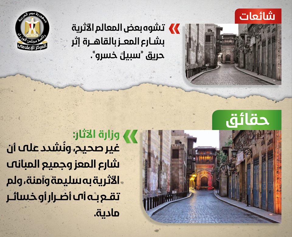 تردد في بعض المواقع الإلكترونية وصفحات التواصل الاجتماعي أنباء حول تشوه بعض المعالم الأثرية بشارع المعز بالقاهرة إثر حريق “سبيل خسرو”، وقد قام المركز الإعلامي لمجلس الوزراء بالتواصل مع وزارة الآثار, والتي نفت تلك الأنباء تماماً, مُؤكدة أنه لا صحة على الإطلاق لما تم تداوله حول تشوه بعض المعالم الأثرية بشارع المعز بالقاهرة إثر حريق “سبيل خسرو”، مُشددةً على أن شارع المعز وجميع المباني الأثرية به سليمة وآمنة، ولم تقع به أي أضرار أو خسائر مادية, وأن كل ما يُثار في هذا الشأن مجرد شائعات لا أساس لها من الصحة تستهدف إثارة البلبلة في أوساط الرأي العام. وأكدت الوزارة على أنها قامت على الفور بعد وقوع الحريق بإرسال فريق من مفتشي آثار المنطقة ومسئولي أمن الآثار إلى شارع المعز؛ للتأكد من سلامة المباني الأثرية، والذي يعتبر متحفاً مفتوحاً للعمارة
