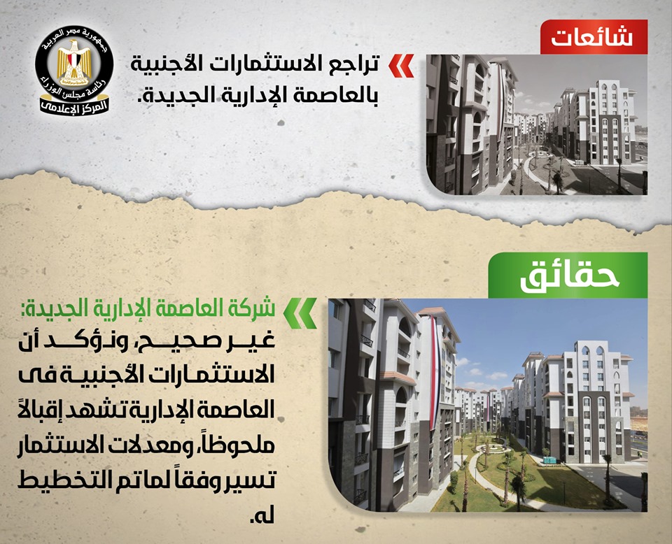 - تداولت بعض وسائل الإعلام وصفحات التواصل الاجتماعي أنباء حول تراجع الاستثمارات الأجنبية بالعاصمة الإدارية الجديدة نتيجة تعقد الإجراءات، وقد قام المركز الإعلامي لمجلس الوزراء بالتواصل مع شركة العاصمة الإدارية الجديدة، والتي نفت تلك الأنباء بشكل قاطع، مُؤكدةً أنه لا صحة لما تردد حول تراجع الاستثمارات الأجنبية بالعاصمة الإدارية الجديدة، وأن الاستثمارات الأجنبية في العاصمة الإدارية تشهد إقبالاً ملحوظاً، ومعدلات الاستثمار تسير وفقاً لما تم التخطيط له، مُؤكدةً أن حجم الاستثمارات في العاصمة الإدارية منذ انطلاق المشروع بلغ نحو 250 مليار جنيه حتى الآن، أي ما يعادل 15 مليار دولار، مُشددةً على حرص الدولة كل الحرص على جذب وتشجيع المستثمرين سواء الأجانب أو المحليين من خلال توفير كافة التسهيلات الممكنة، وأن كل ما يُثار في هذا الشأن مجرد شائعات لا
