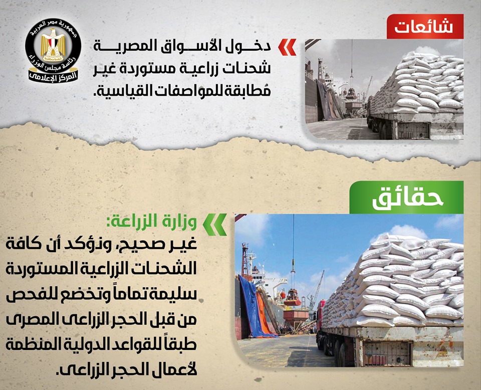 تداولت بعض المواقع الإلكترونية وصفحات التواصل الاجتماعي أنباء عن دخول الأسواق المصرية شحنات زراعية مستوردة غير مُطابقة للمواصفات القياسية، وقد قام المركز الإعلامي لمجلس الوزراء بالتواصل مع وزارة الزراعة واستصلاح الأراضي, والتي نفت صحة تلك الأنباء تماماً، مُؤكدةً أنه لا صحة لدخول شحنات زراعية