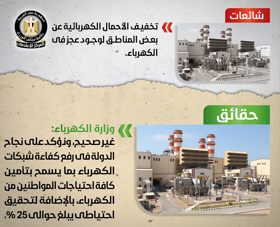 انتشر في بعض المواقع الإلكترونية وصفحات التواصل الاجتماعي أنباء حول قيام وزارة الكهرباء بتخفيف الأحمال الكهربائية عن بعض المناطق لعدم توافر الطاقة الكهربائية بشكل كافي، وقد قام المركز الإعلامي لمجلس الوزراء بالتواصل مع وزارة الكهرباء والطاقة