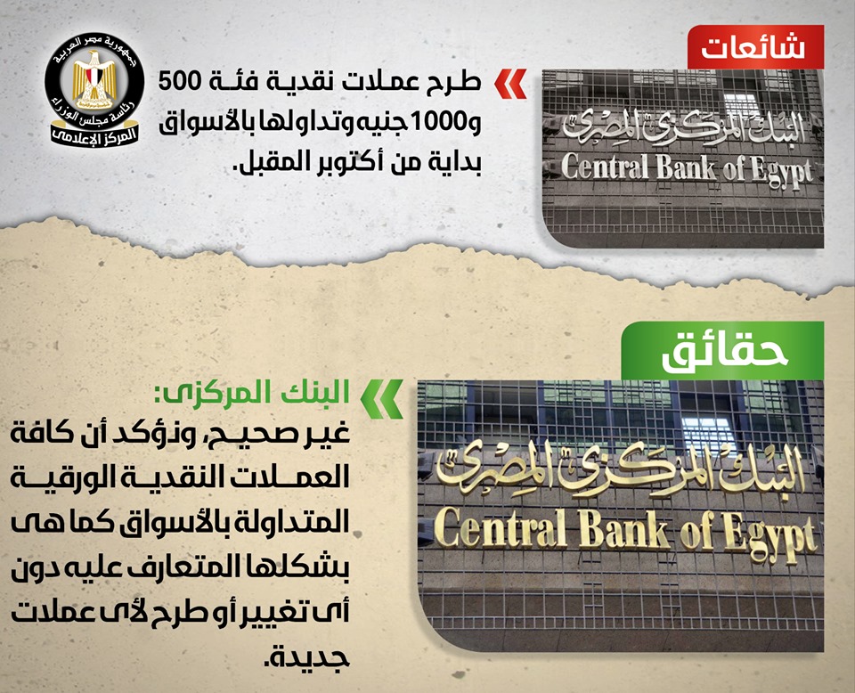 أُثير في بعض المواقع الإلكترونية وصفحات التواصل الاجتماعي أنباء حول طرح عملات نقدية فئة 500 و1000جنيه وتداولها بالأسواقبدايةً من شهر أكتوبر المقبل, ورغم نفي المركز الإعلامي لمجلس الوزراء لهذه الشائعة في تقارير سابقة له بالعددين (117) و(127), إلا أنه لوحظ إعادة تداولها مرة أخرى خلال الفترة الحالية, مما دفع المركز للتواصل مجدداً مع البنك المركزي المصري, والذي نفى صحة تلك الأنباء, مُؤكداًَ أنه لا نية لإصدار أي عملات نقدية جديدة سواء فئتي 500 و1000جنيه أو أي فئات أخرى، مُشدداً على أن كافة العملات النقدية الورقية المتداولة بالأسواق كما هي بشكلها المتعارف عليه دون أي تغيير أو طرح لأي عملات جديدة، وأن كل ما يثار في هذا الشأن شائعات لا أساس له من الصحة
