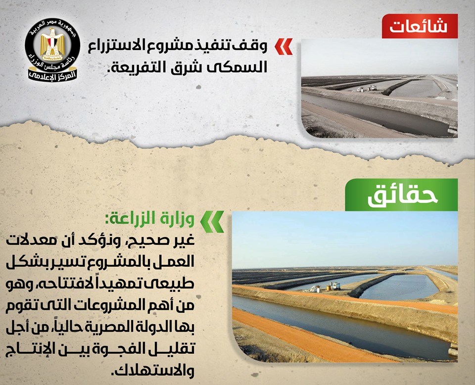 تداولت بعض وسائل الإعلام وصفحات التواصل الاجتماعي أنباء حول وقف الحكومة تنفيذ مشروع الاستزراع السمكي شرق التفريعة، وقد قام المركز الإعلامي لمجلس الوزراء بالتواصل مع وزارة الزراعة واستصلاح الأراضي, والتي نفت تلك الأنباء بشكل قاطع, مُؤكدةً أنه لا صحة لما تردد حول وقف تنفيذ مشروع الاستزراع السمكي شرق التفريعة، وأن معدلات العمل بالمشروع تسير بشكل طبيعي تمهيداً لافتتاحه، مُشددةً على أنه من أهم المشروعات التي تقوم بها الدولة المصرية حالياً، من أجل تقليل الفجوة بين الإنتاج والاستهلاك، وأن كل ما يتردد حول هذا الشأن