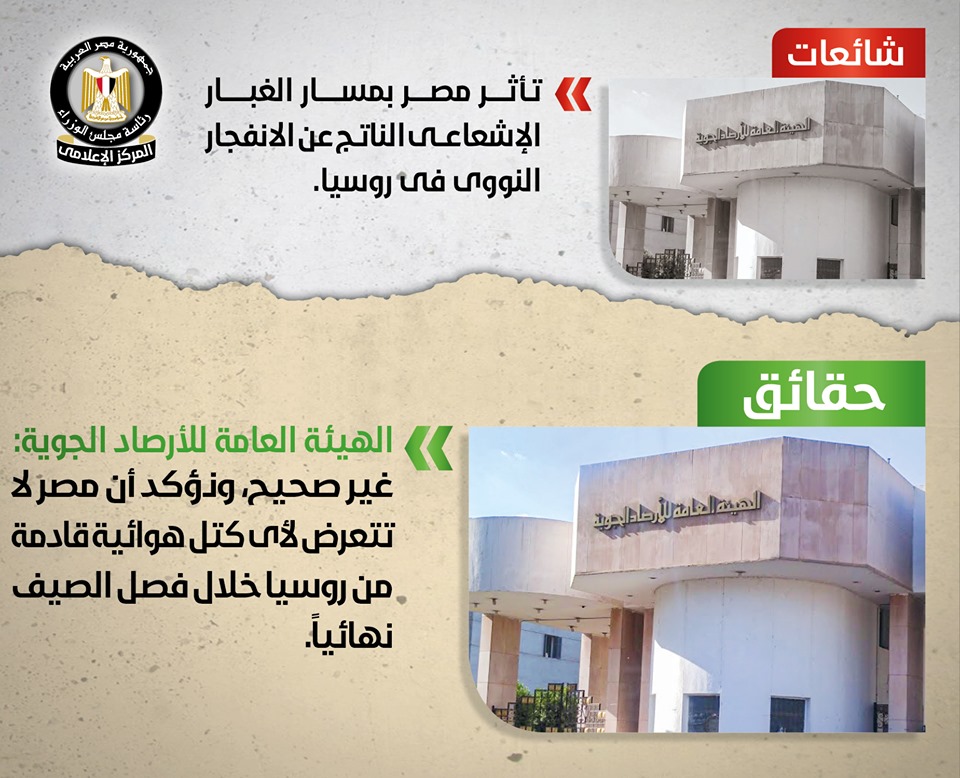 تردد في بعض وسائل الإعلام والمواقع الإلكترونية وصفحات التواصل الاجتماعي أنباء حول تأثر مصر بمسار الغبار الإشعاعي الناتج عن الانفجار النووي بمدينة “سفرودفنسك” الروسية، وقد قام المركز الإعلامي لمجلس الوزراء بالتواصل مع الهيئة العامة للأرصاد الجوية، والتي نفت تلك الأنباء تماماً، مُؤكدةً أنه لا صحة لتأثر مصر بمسار الغبار الإشعاعي الناتج عن الانفجار النووي بمدينة “سفرودفنسك” الروسية، مُشددةً على أن مصر لا تتعرض لأي كتل هوائية قادمة من روسيا خلال فصل الصيف نهائياً، وأن كل ما يثار في هذا الشأن مجرد شائعات لا أساس لها من الصحة تستهدف إثارة القلق والذعر بين المواطنين.
