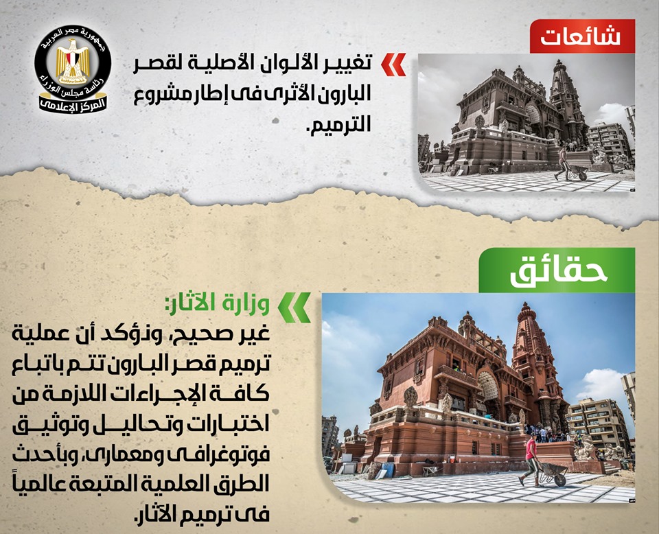 في إطار مشروع ترميم القصر، وقد قام المركز الإعلامي لمجلس الوزراء بالتواصل مع وزارة الآثار, والتي نفت تلك الأنباء بشكل قاطع, مُؤكدةً أنه لا صحة على الإطلاق لما تردد، وأن ألوان الواجهات الخاصة بالقصر هي نفس الألوان الأصلية، مُؤكدةً أن عملية ترميم قصر البارون تتم باتباع كافة الإجراءات اللازمة من اختبارات وتحاليل وتوثيق فوتوغرافي ومعماري، وبأحدث الطرق العلمية المتبعة عالمياً في ترميم الآثار؛ من أجل الحفاظ على طبيعتها الأصلية وهويتها الأثرية، وأن كل ما يتردد حول هذا الشأن شائعات لا أساس لها من الصحة تستهدف إثارة غضب المواطنين. وأشارت الوزارة إلى وضع اللمسات الأخيرة على قصر البارون؛ تمهيداً لافتتاحه أمام الجمهور خلال شهر نوفمبر المقبل، وذلك بعدما أنهت الوزارة نحو 85% من أعمال الترميم، التي شملت الانتهاء من أعمال التدعيم