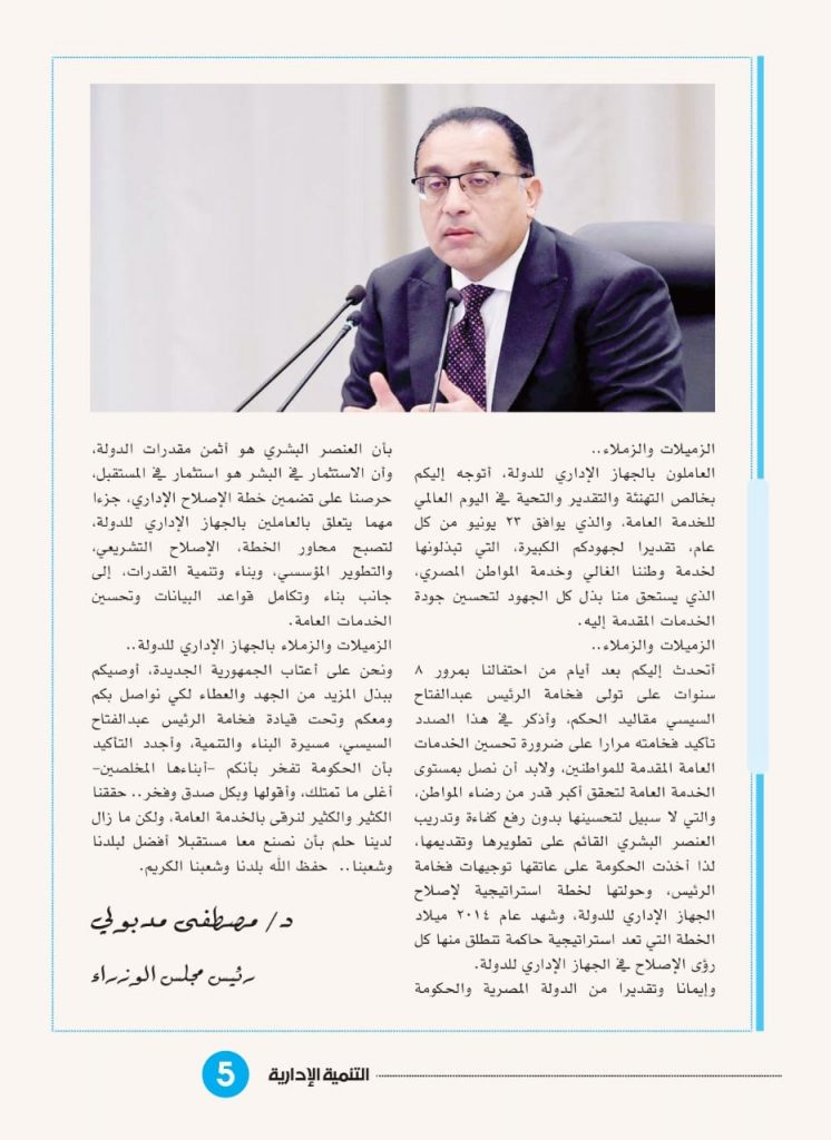 ونحن على أعتاب الجمهورية الجديدة، أوصيكم ببذل المزيد من الجهد والعطاء لكي نواصل بكم ومعكم وتحت قيادة فخامة الرئيس عبدالفتاح السيسي، مسيرة البناء والتنمية، وأجدد التأكيد بأن الحكومة تفخر بأنكم -أبناءها المخلصين- أغلى ما تمتلك، وأقولها وبكل صدق وفخر.. حققنا الكثير والكثير لنرقى بالخدمة العامة، ولكن ما زال لدينا حلم بأن نصنع معا مستقبلا أفضل لبلدنا وشعبنا..