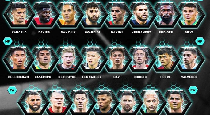 خط الوسط: جود بيلينجهام (بروسيا دورتموند-إنجلترا)، كاسيميرو (ريال مدريد/مانشستر يونايتد- البرازيل)، كيفين دي بروين (مانشستر سيتي- بلجيكا)، إنزو فيرنانديز (بنفيكا/تشيلسي- الأرجنتين)، جافي (برشلونة- إسبانيا)، لوكا مودريتش (ريال مدريد- كرواتيا)، بيدري (برشلونة- إسبانيا)، فيدريكو فالفيردي (ريال مدريد- الأوروجواي).