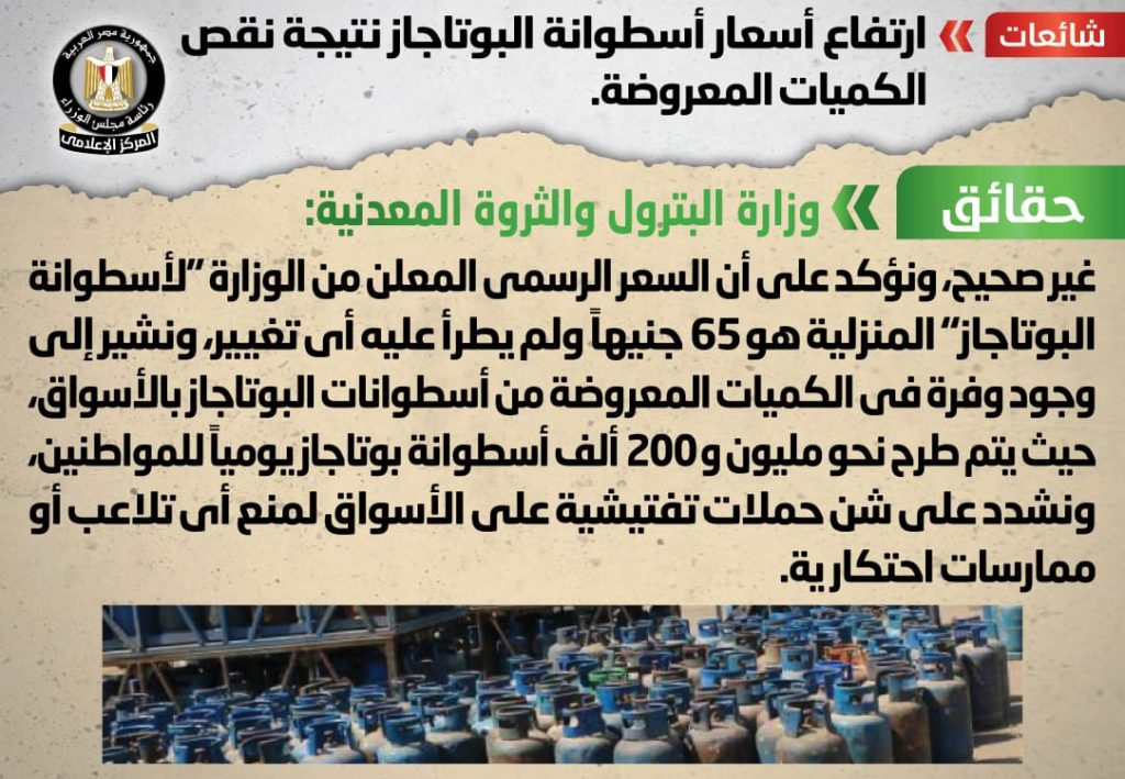أنباء بشأن ارتفاع أسعار أسطوانة البوتاجاز نتيجة نقص الكميات المعروضة، وقد قام المركز الإعلامي لمجلس الوزراء بالتواصل مع وزارة البترول والثروة المعدنية، والتي نفت تلك الأنباء، مُؤكدةً أنه لا صحة لارتفاع أسعار أسطوانة البوتاجاز، وإنه لا يوجد نقص في الكميات المعروضة، مُوضحةً أن السعر الرسمي المعلن من الوزارة “لأسطوانة البوتاجاز” المنزلية هو 65 جنيهاً ولم يطرأ عليه أي تغيير، مُشيرةً إلى وجود وفرة في الكميات المعروضة من أسطوانات البوتاجاز بالأسواق، حيث يتم طرح نحو مليون و200 ألف أسطوانة بوتاجاز يومياً للمواطنين، مُشددةً على شن حملات تفتيشية على الأسواق لمنع أي تلاعب أو ممارسات احتكارية.وفي سياق متصل، شهدت الفترة الأخيرة زيادة في استهلاك الغاز الطبيعي على حساب مصادر الطاقة الأخرى، كما ارتفعت عدد الوحدات السكنية التي تم توصيل الغاز الطبيعي خلال الـ 3 سنوات الماضية، حيث وصل عددها إلى 11.5مليون وحدة سكنية حالياً، مقابل 8.2 مليون وحدة سكنية في سبتمبر2017.ونناشد وسائل الإعلام المختلفة ومرتادي مواقع التواصل الاجتماعي، تحري الدقة في نشر الأخبار، والتواصل مع الجهات المعنية للتأكد من الأخبار قبل نشر معلومات لا تستند إلى أي حقائق، وتؤدي إلى إثارة البلبلة بين المواطنين، وفي حالة وجود أي استفسارات يرجى الرجوع إلى الموقع الرسمي للوزارة (petroleum.gov.eg).#شائعات_حقائق