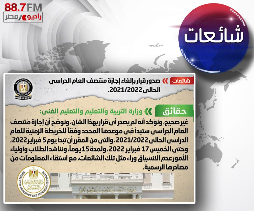 انتشر في بعض المواقع الإلكترونية وصفحات التواصل الاجتماعي أنباء بشأن صدور قرار بإلغاء إجازة منتصف العام الدراسي الحالي 2021/2022، وقد قام المركز الإعلامي لمجلس الوزراء بالتواصل مع وزارة التربية والتعليم والتعليم الفني،