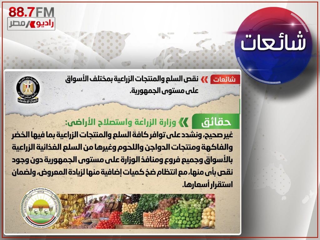 انتشر في بعض المواقع الإلكترونية وصفحات التواصل الاجتماعي أنباء حول نقص السلع والمنتجات الزراعية بمختلف الأسواق على مستوى الجمهورية، وقد قام المركز الإعلامي لمجلس الوزراء بالتواصل مع وزارة الزراعة واستصلاح الأراضي، والتي نفت تلك الأنباء، مُؤكدةً أنه لا صحة لوجود أي نقص في السلع أو المنتجات الزراعية بأي من الأسواق على مستوى الجمهورية، مُشددةً على توافر كافة السلع والمنتجات الزراعية بما فيها الخضر والفاكهة ومنتجات الدواجن واللحوم وغيرها من السلع الغذائية الزراعية بالأسواق وجميع فروع ومنافذ الوزارة على مستوى الجمهورية دون وجود نقص بأي منها، مع انتظام ضخ كميات إضافية منها لزيادة المعروض، ولضمان استقرار أسعارها.
