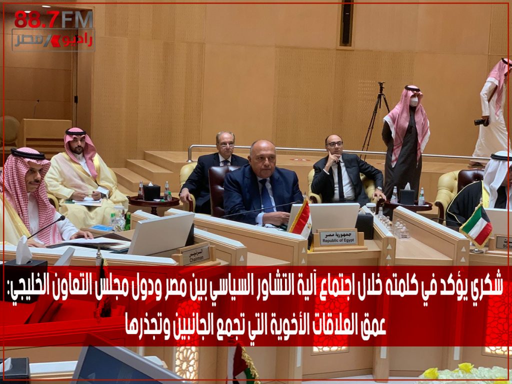 شكري يؤكد في كلمته خلال اجتماع آلية التشاور السياسي بين مصر ودول مجلس التعاون الخليجي:•عمق العلاقات الأخوية التي تجمع الجانبين وتجذرها •مواصلة تعزيز العلاقات بين الجانبين بما يحقق تطلعات شعوبنا في التنمية والرخاء•ضرورة تكثيف التنسيق إزاء التحديات غير المسبوقة في المنطقة•أمن الخليج العربي وبلدانه الشقيقة جزءاً لا يتجزأ من أمن مصر .