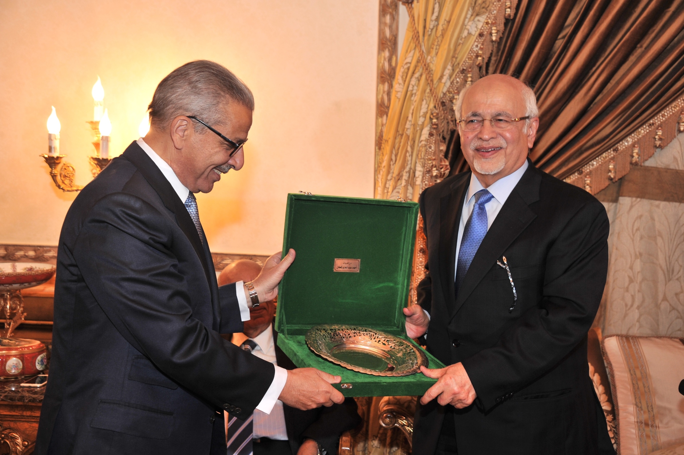 وفى نهاية الامسية الثقافية، قدم السفير قطان، هدية تذكارية إلى الدكتور عبد العزيز خوجه عبارة عن طبق يحمل شعار المملكة العربية السعودية.