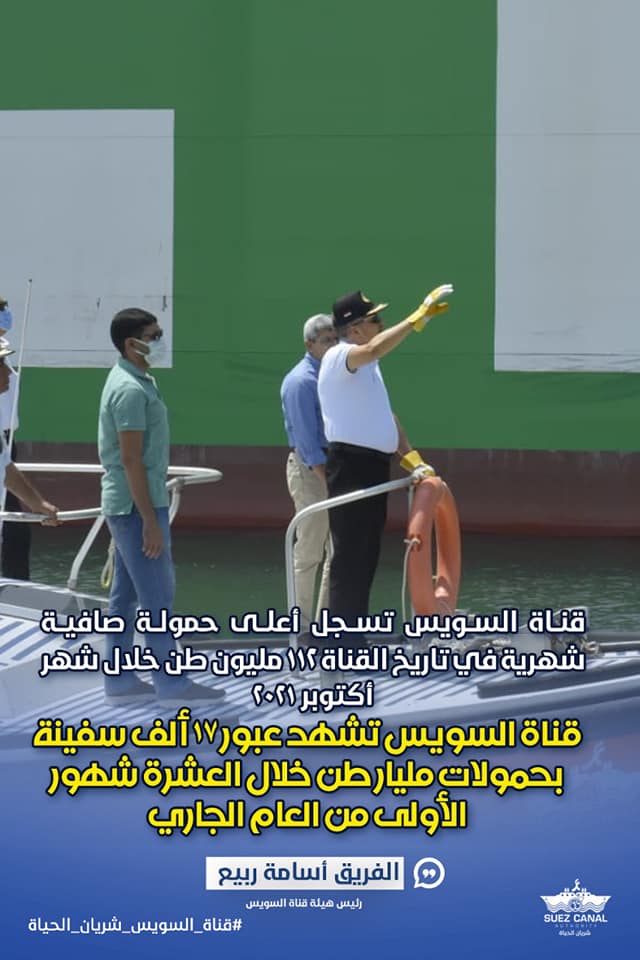 أعلن الفريق أسامة ربيع رئيس هيئة قناة السويس، اليوم الثلاثاء، بأن إحصائيات الملاحة بالقناة خلال شهر أكتوبر 2021 سجلت أرقاماً قياسية غير مسبوقة محققة أعلى حمولة شهرية في تاريخ القناة قدرها 112.1مليون طن.