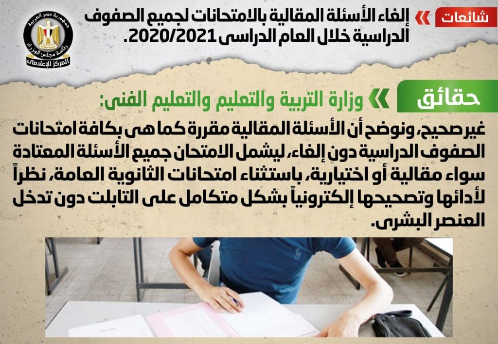 وقد قام المركز الإعلامي لمجلس الوزراء بالتواصل مع وزارة التربية والتعليم والتعليم الفني، والتي نفت تلك الأنباء، مُؤكدةً أنه لا صحة لإلغاء الأسئلة المقالية بالامتحانات لجميع الصفوف الدراسية خلال العام الدراسي 2020/2021، مُوضحةً أن الأسئلة المقالية مقررة كما هي بكافة امتحانات الصفوف الدراسية دون إلغاء، ليشمل الامتحان جميع الأسئلة المعتادة سواء مقالية أو اختيارية، باستثناء امتحانات الثانوية العامة، نظراً لأدائها وتصحيحها إلكترونياً بشكل متكامل على التابلت دون تدخل العنصر البشري. وفي سياق متصل، ستعتمد منظومة التعليم الجديدة في الثانوية العامة للعام 2020/2021، على إعداد الأسئلة قبل الامتحانات بـ 5 ثواني فقط على الكمبيوتر، وإرسالها إلى الطلاب مباشرة دون تدخل العنصر البشري، الأمر الذي يسهم في منع أي شخص من الاطلاع على الامتحانات، بما يقضي على ظاهرة الغش وتسريب الامتحانات نهائياً. ونناشد جميع وسائل الإعلام المختلفة ومرتادي مواقع التواصل الاجتماعي تحري الدقة والموضوعية في نشر الحقائق والتواصل مع الجهات المعنية للتأكد قبل نشر معلومات لا تستند إلى أي حقائق، وتؤدي إلى إثارة البلبلة بين الطلاب وأولياء الأمور، وتؤثر سلباً على أوضاع المنظومة التعليمية، وفي حالة وجود أي شكاوى أو استفسارات يرجى الاتصال على رقم الوزارة (0227963273).#شائعات_حقائق