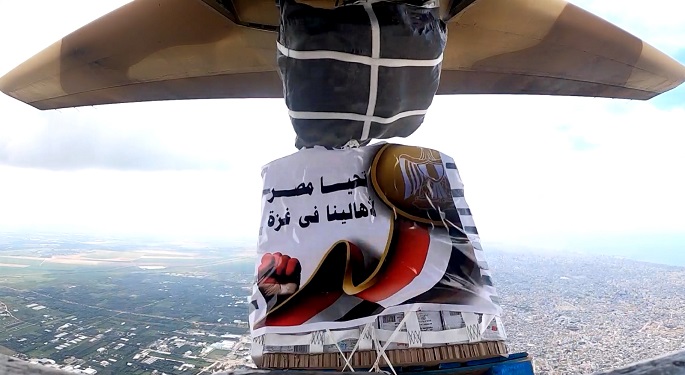 تواصل القوات الجوية المصرية بالتعاون مع نظيرتها الإماراتية، تنفيذ أعمال الإسقاط الجوي من مطار العريش لأطنان من المساعدات الغذائية ومواد الإغاثة العاجلة على المناطق المعزولة بشمال قطاع غزة.