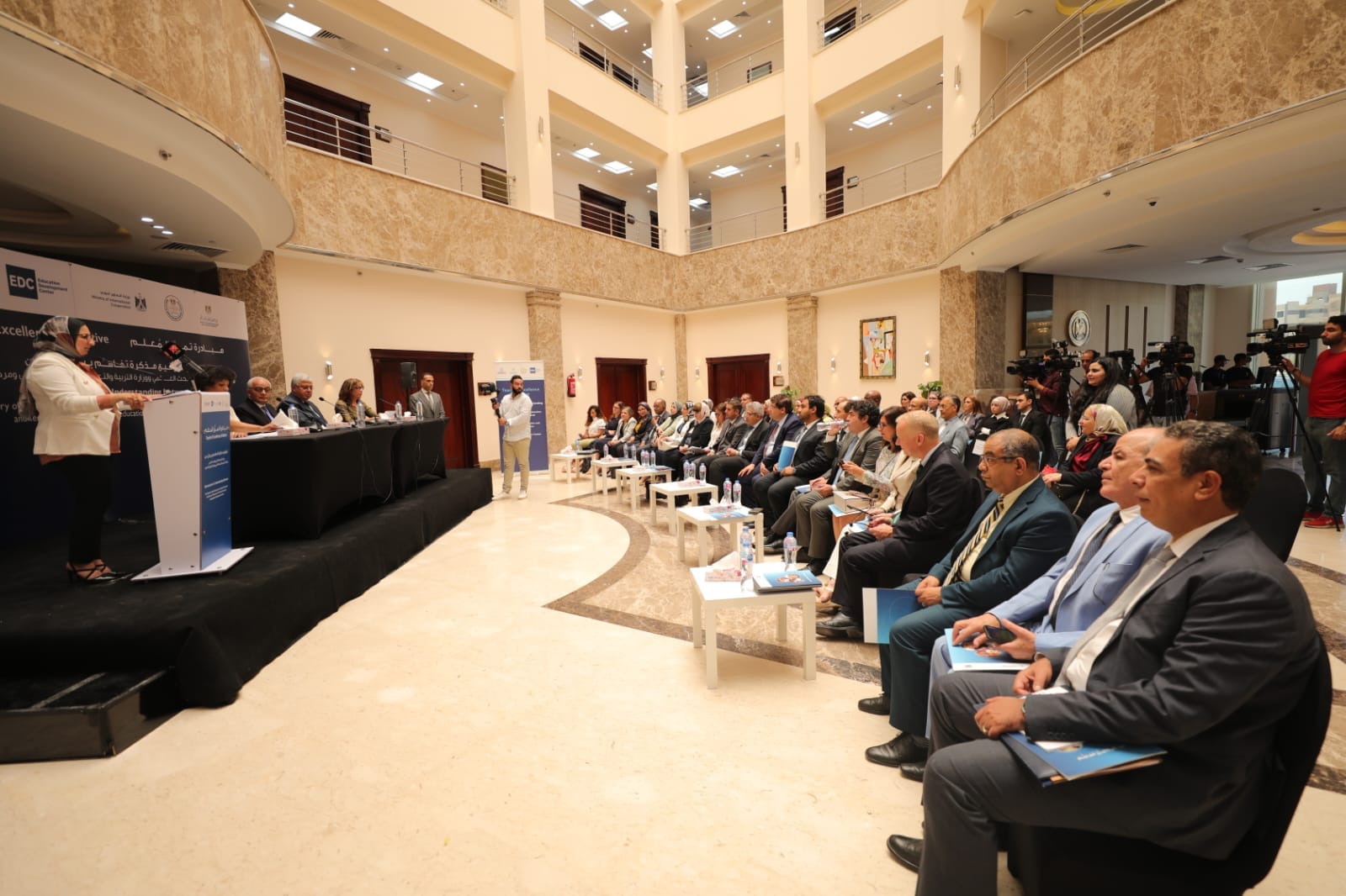 شهد د. أيمن عاشور وزير التعليم العالى والبحث العلمى، د. رضا حجازى وزير التربية والتعليم والتعليم الفنى اليوم الإثنين مراسم توقيع بروتوكول للتعاون مع مركز تطوير التعليم (EDC) والذى يمثله د. أندريا بوش المدير العام لمبادرة تميز المعلم والممول من الوكالة الأمريكية للتنمية الدولية؛ لإعداد وتدريب المعلمين، وذلك بحضور د.مصطفى رفعت أمين المجلس الأعلى للجامعات، د.أيمن فريد مساعد الوزير للتخطيط الإستراتيجى والتدريب والتأهيل لسوق العمل، د.محمد الشرقاوى مساعد الوزير للسياسات والشئون الاقتصادية، السيدة/ مارجريت سانشو القائم بأعمال ونائب مدير الوكالة الأمريكية للتنمية الدولية فى مصر، وأ.شريهان بخيت مساعد وزيرة التعاون الدولي، د.عادل عبدالغفار المستشار الإعلامى والمتحدث الرسمى للوزارة، أ. السيد عطا رئيس قطاع التعليم بوزارة التعليم العالي والبحث العلمي، أ. محمد محمود أبوزيد رئيس الإدارة المركزية لشئون مكتب الوزير، وذلك بمبنى التعليم الخاص بالقاهرة الجديدة.