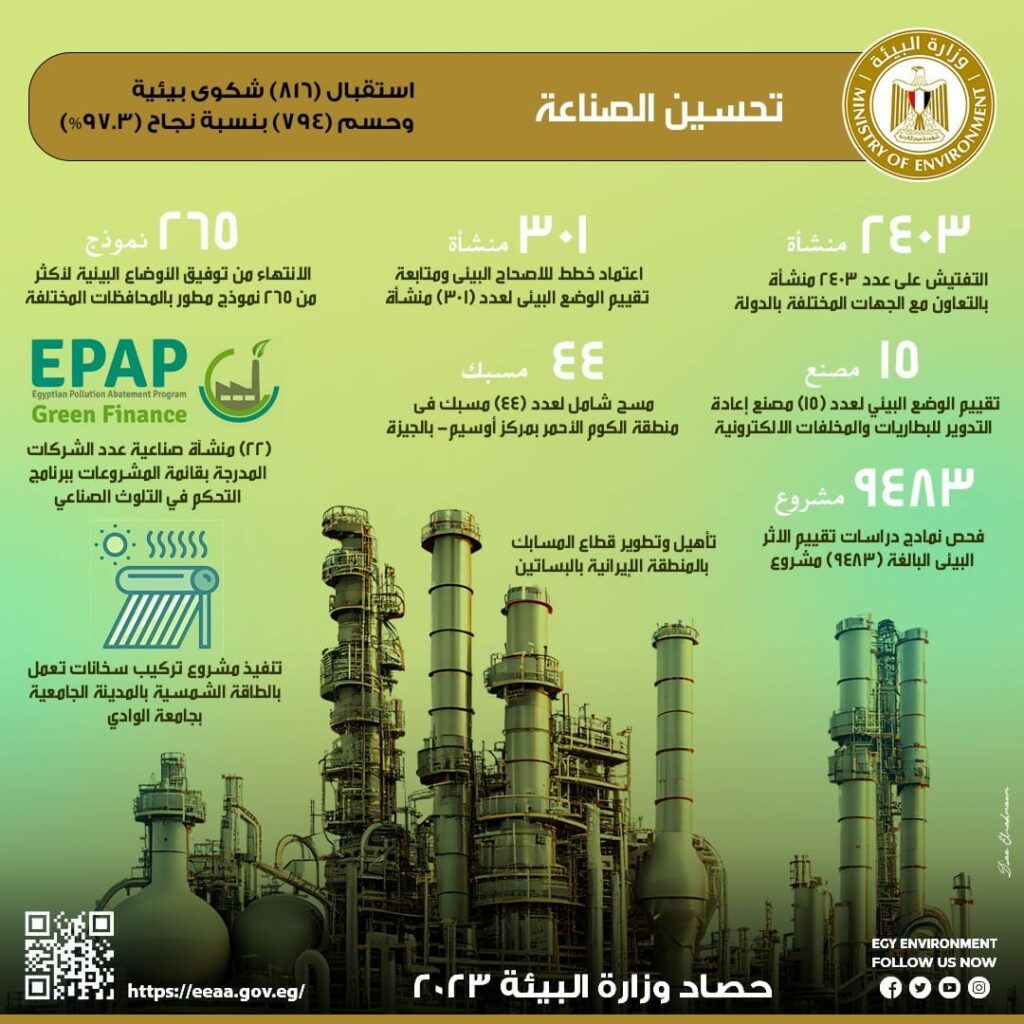 وفى إطار دعم الصناعة المصرية لتطوير كفاءه الطاقة والموارد وتحقيق الالتزام بالقوانين البيئية، أشارت وزيرة البيئة إلى بلوغ عدد الشركة المدرجة بقائمة المشروعات ببرنامج التحكم في التلوث الصناعي حتى ديسمبر 2023 (22) منشآة صناعية لعدد (30) مشروع فرعي بإجمالي استثمارات تبلغ 192,19 مليون يورو، وتصل مساهمة البرنامج إلى حوالي 131،34 مليون يورو بالإضافة إلى (36) مشروع فرعي للصناعات الصغيرة والمتوسطة (SME) بإجمالي استثمارات 19،681 مليون يورو.