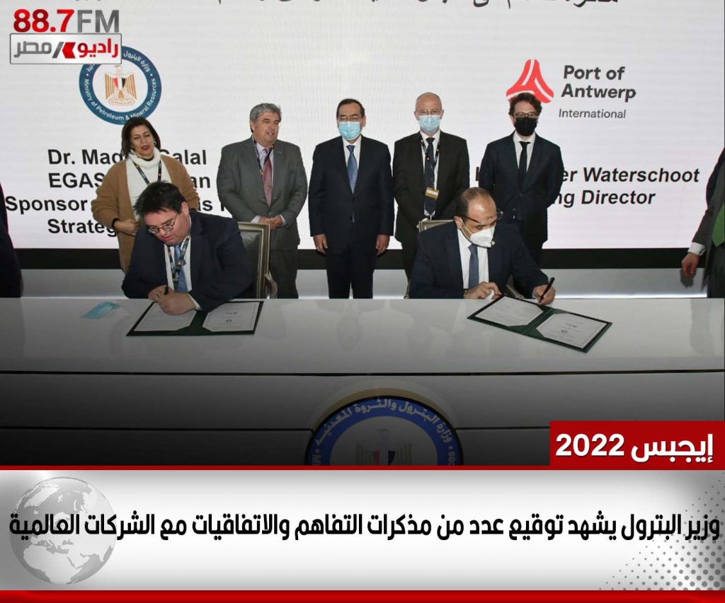 ومذكرة تفاهم بين PAI (port of Antwerp Int) ووزارة البترول والثروة المعدنية لتنمية الموانئ ودعم أعمال تطويرها -استكشاف الإمكانات ومتابعة المشاريع في الموانئ المصرية والسوق البحرية، باستخدام خبرة أنتويرب في تعزيز الموانئ وإدارتها وتشغيلها، وقعها عن الوزارة علاء حجر، رئيس الإدارة المركزية للمكتب الفني، وكريستوفر ووتر شوت، المدير العام لهيئة ميناء أنتويرب.