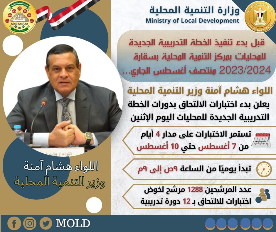 أعلن اللواء هشام آمنة وزير التنمية المحلية، عن بدء اختبارات تحديد المستوي للالتحاق ببعض الدورات التي تتضمنها الخطة التدريبية الجديدة للمحليات 2024/2023 بمركز التنمية المحلية بسقارة، اليوم الأثنين الموافق 7 أغسطس وتستمر الاختبارات على مدار 4 أيام علي ان تنتهي يوم 10 أغسطس، وتبدأ الاختبارات يوميًا من الساعة ٩ص إلى ٩م ، لتصفية المرشحين من المحافظات والوزارة والذي يبلغ عددهم 1288 مرشح، من خلال تنفيذ اختبارات تحديد المستوي لـ 12 دورة تدريبية، وذلك قبل بدء تنفيذ الخطة التدريبية الجديدة المقرر تنفيذها منتصف شهر أغسطس الجاري.