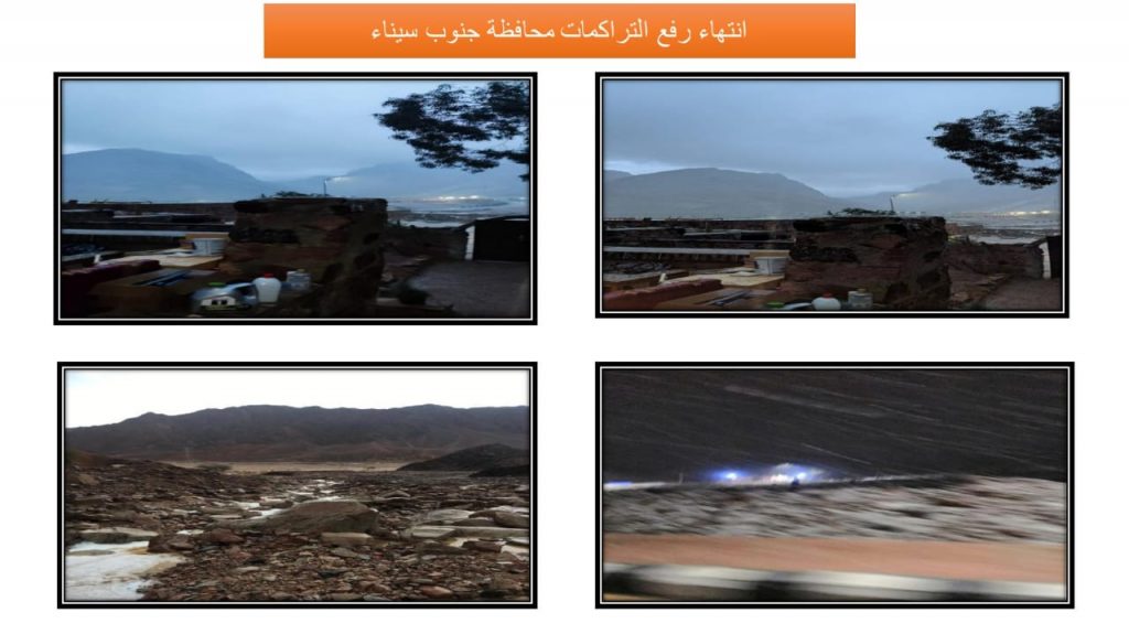 وأوضح التقرير توقف الأمطار على مدن شرم الشيخ و طور سيناء و نوبيع و رأس سدر و دهب و سانت كاترين و أبو زنيمة بمحافظة جنوب سيناء ، مع طقس شديد البرودة على معظم أنحاء المحافظة ، و نتج عن الأمطار الغزيرة التى تعرضت لها المحافظة ، وانقطاع الكهرباء عن مدينتي طور سيناء و شرم الشيخ لمدة ٤ ساعات ، وقامت المحافظة بتشغيل الكهرباء فى شرم الشيخ على خط نويبع ، واصلاح عطل الكهرباء على مدينة طور سيناء.