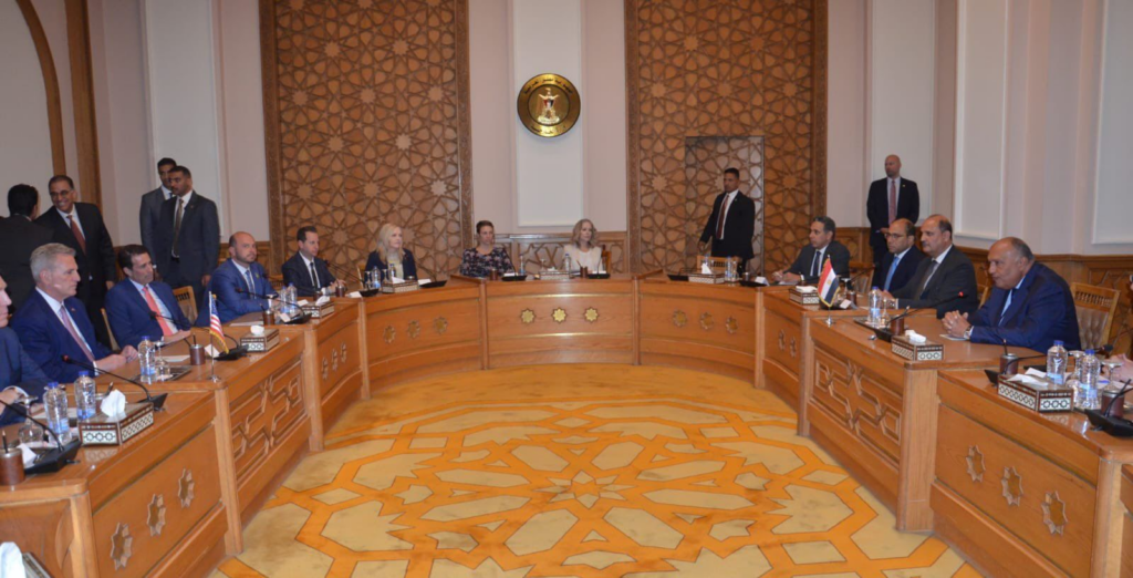 ومن جانبهم، جاءت مداخلات أعضاء وفد الكونجرس الأمريكى لتؤكد على مغزى تضمين مصر في أول زيارة لرئيس مجلس النواب الأمريكى إلى الشرق الأوسط، وما يعكسه ذلك من خصوصية واستراتيجية العلاقة بين البلدين. وقد تطرقت المباحثات لمختلف جوانب العلاقات الثنائية المصرية/ الأمريكية، والأوضاع المتوترة في إقليم الشرق الأوسط والمنطقة العربية وإفريقيا، فضلاً عن التحديات الاقتصادية التي تواجه مصر نتيجة الظروف الدولية الراهنة وما يمكن للولايات المتحدة أن تقدمه لدعم مصر اقتصادياً.