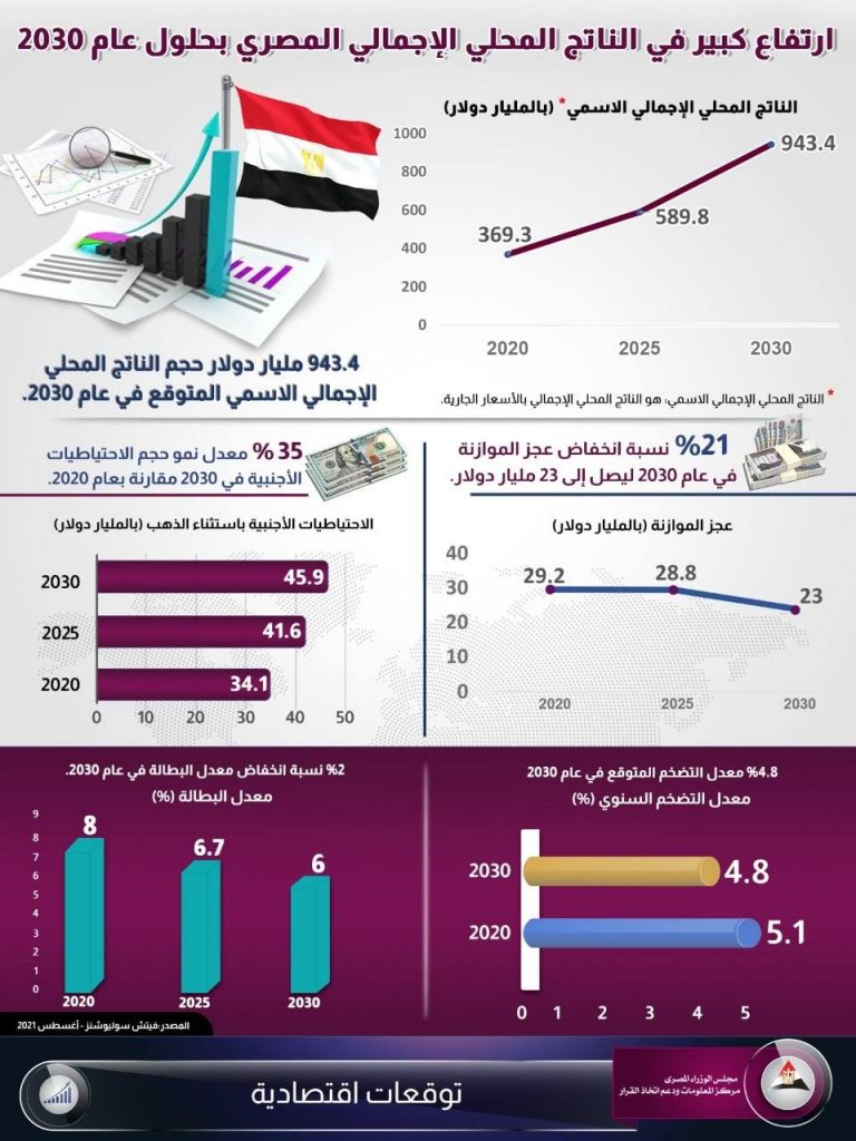 توقعات متفائلة لأهم مؤشرات الاقتصاد_المصري في عام 2030، فوفقًا لفيتش_سوليوشنز من المتوقع زيادة حجم الناتج المحلي الإجمالي الاسمي ليصل إلى 943.4 مليار دولار في عام 2030، وزيادة حجم الاحتياطيات_الأجنبية بنسبة 35% مقارنة بعام 2020، بالإضافة إلى انخفاض كلٍّ من عجز الموازنة و معدل #البطالة و معدل #التضخم بنسبة 21%، 2%، 0.3% على التوالي.